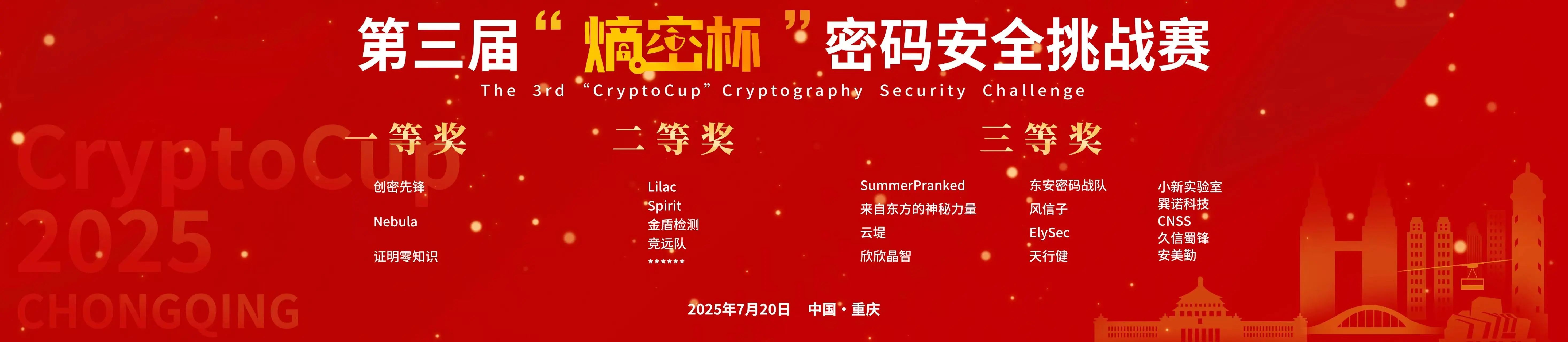 2025年7月19日,在中国密码学会、重庆市密码管理局指导下,由国家信息技术安全研究中心主办的第三届“熵密杯”密码安全挑战赛在重庆科学会堂圆满收官。 作为国内密码安全领域的权威竞技平台,“熵密杯”汇聚全国顶尖机构与精英战队,以高难度、实战化赛题检验参赛者密码分析、攻防对抗与系统防护的硬核实力,是检验国内密码安全技术水平的“试金石”。 01顶级赛场,权威认证 百舸争流,奋楫者先;千帆竞发,勇进者胜。来自全国31个省(自治区、直辖市)的600余名密码专业技术人才,组成205支战队,同场竞技,赛事聚焦密码算法分析与实现、密码协议分析与攻击、密码应用系统安全防护等核心领域,设置极具挑战性的智能网联汽车典型密码应用场景,旨在全面考察参赛队伍在密码分析、漏洞挖掘、安全防护等方面的综合能力,是检阅我国密码领域实战能力的重要平台。